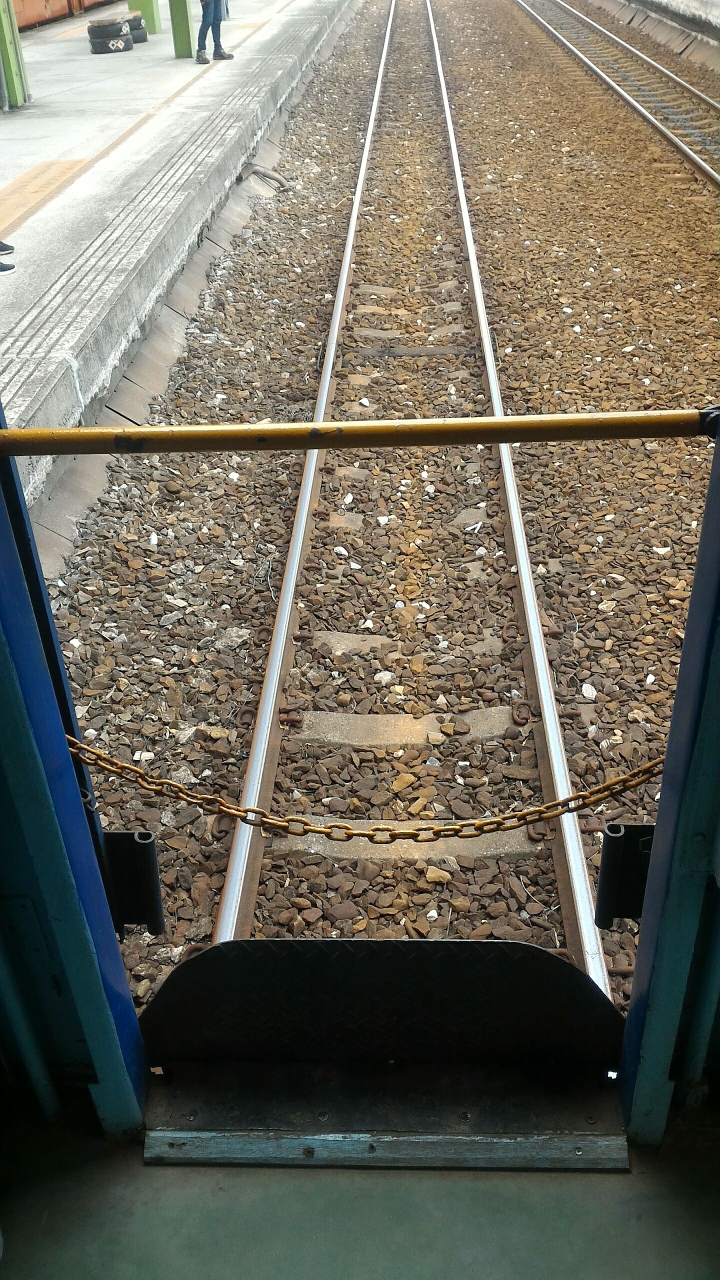 因為坐的是最後一節車廂,所以車尾可以看到風景;後面完全是空的,就只有一根橫桿而已。